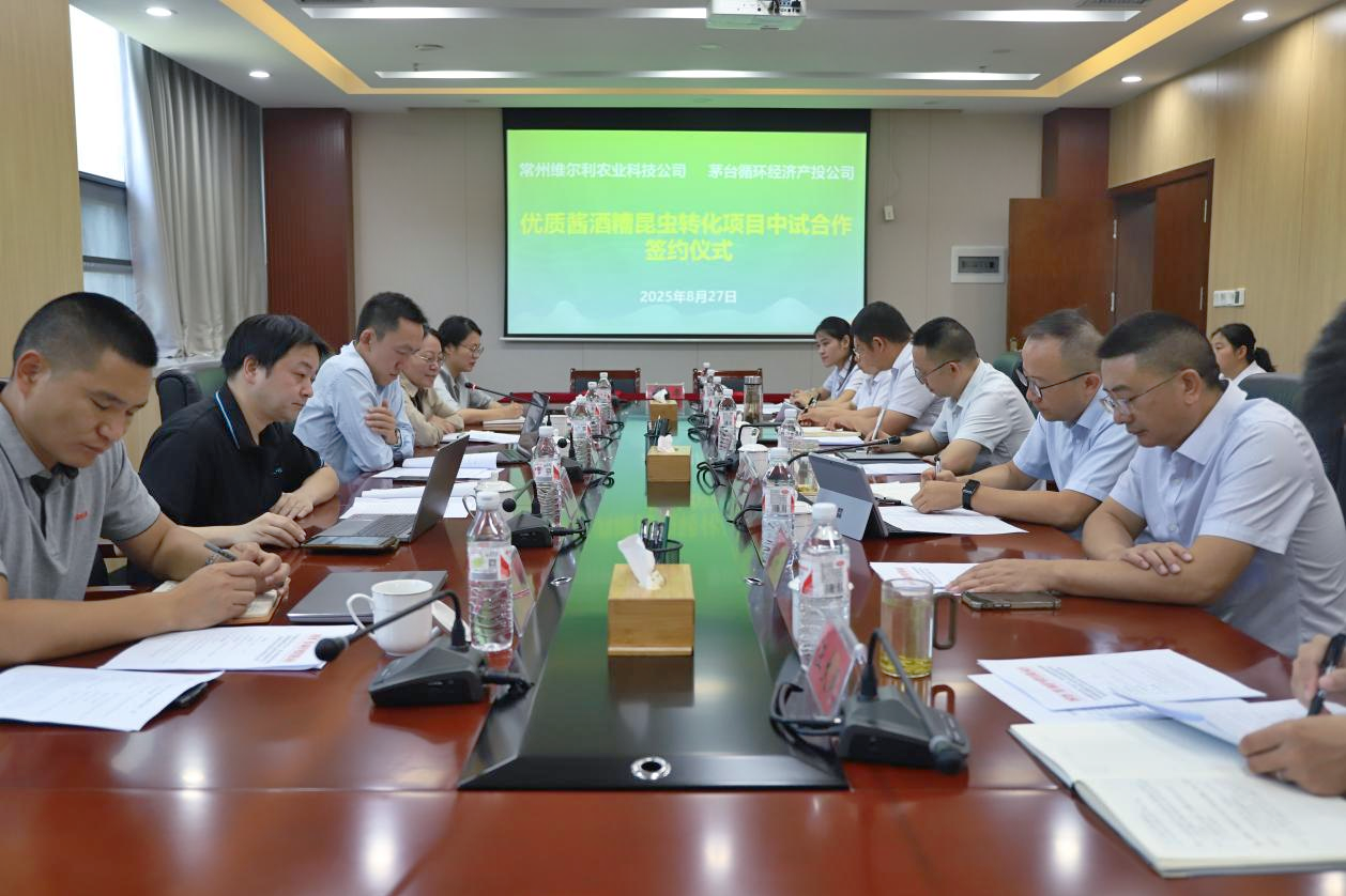 8月27日上午,维尔利集团旗下常州维尔利农业科技发展有限公司(下称“维尔利农业”)与贵州茅台酒厂 (集团) 循环经济产业投资开发有限公司(下称“茅台循环产投公司”)正式签署中试合作协议。双方将携手开展“优质酱酒糟黑水虻昆虫转化资源利用中试验证研究” 项目,打造“酱酒糟——昆虫蛋白——宠粮”产业链,共同探索酿酒副产物资源化利用的创新路径。